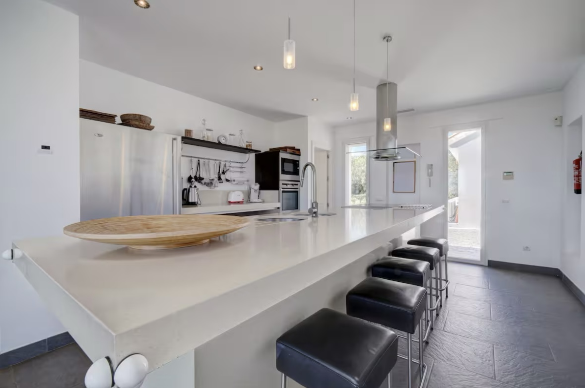Planta principal: Vestíbulo con vestidor y aseo de cortesía, salón-comedor, cocina de alta gama totalmente equipada, lavadero, dos dormitorios de invitados con baño en suite. Acceso directo a las terrazas cubiertas y descubiertas, al jardín y a la piscina.